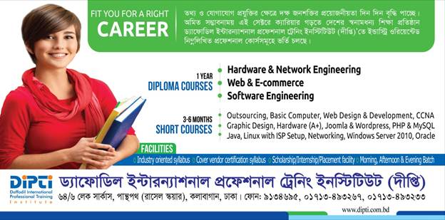 ড্যাফোডিল ইন্টারন্যাশনাল প্রফেশনাল ট্রেনিং ইনস্টিটিউট (দীপ্তি), ৬৪/৬, লেকসার্কাস, পান্থপথ (রাসেল স্কয়ার), কলাবাগান, ঢাকা-১২০৫। ফোনঃ ৯১৩৪৬৯৫, ০১৭১৩৪৯৩২৬৭ এবং ০১৭১৩৪৯৩২৩৩