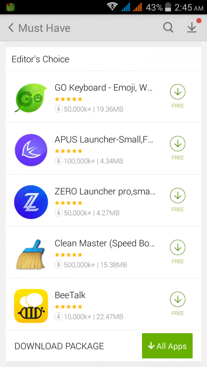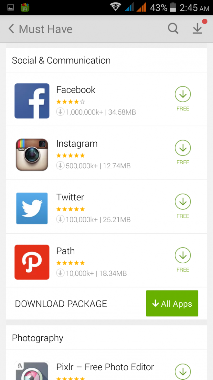 সবচেয়ে সুবিধার ব্যাপার হলো প্রতিটি ক্যাটাগরির নিচে আপনি download all নামের একটি বাটন দেখতে পাবেন যাতে ক্লিক করলে আপনি সে ক্যাটাগরির সকল অ্যাপ একবারে ডাউলোড ও ইন্স শুরুহবে। আপনাকে আর একটা একটা করে ডাউনলোড করতে হবে না। যা গুগল প্লেস্টোরো সম্ভব নয়।