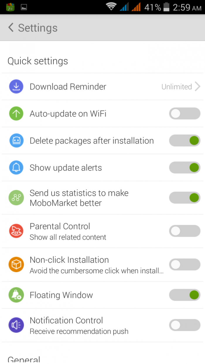 এখানে আপনি ওয়াইফাই ছাড়া ডাউনলোড করলে এলার্ট পাওয়া, ওয়াইফাই থাকাকালীন অটো আপডেট, ইন্সটলের পরপরই apk সয়ংক্রিয়ভাবে ডিলিট হয়ে যাওয়া, কোন অ্যাপের আপডেট রিলিজ হলে এলার্ট পাওয়া, Parental control এর মাধ্যমে কী ধরনের অ্যাপ দেখাযাবে তা নিয়ন্ত্রণ করা, Floating Window দেখা, এসকল অপশন পাওয়া যাবে যার মাধ্যমে আপনি আপনার পছন্দ মত অপশন চালু বা বন্ধ করতে পারবেন।