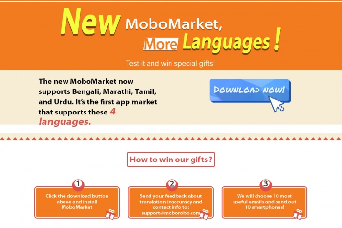 Mobo Market এর অনুবাদ সংশোধন করে আপনি জিতে নিতে পারেন ফ্রি স্মার্ট ফোন। এর জন্য http://www.mobomarket.net/act/IndiaLandingPage/index.htm এ যনা Download Now বাটনে ক্লিক করে MoboMarket এর APK টি নামিয়ে নিন। আপনার ফোনে ইন্সটল করে নিন।