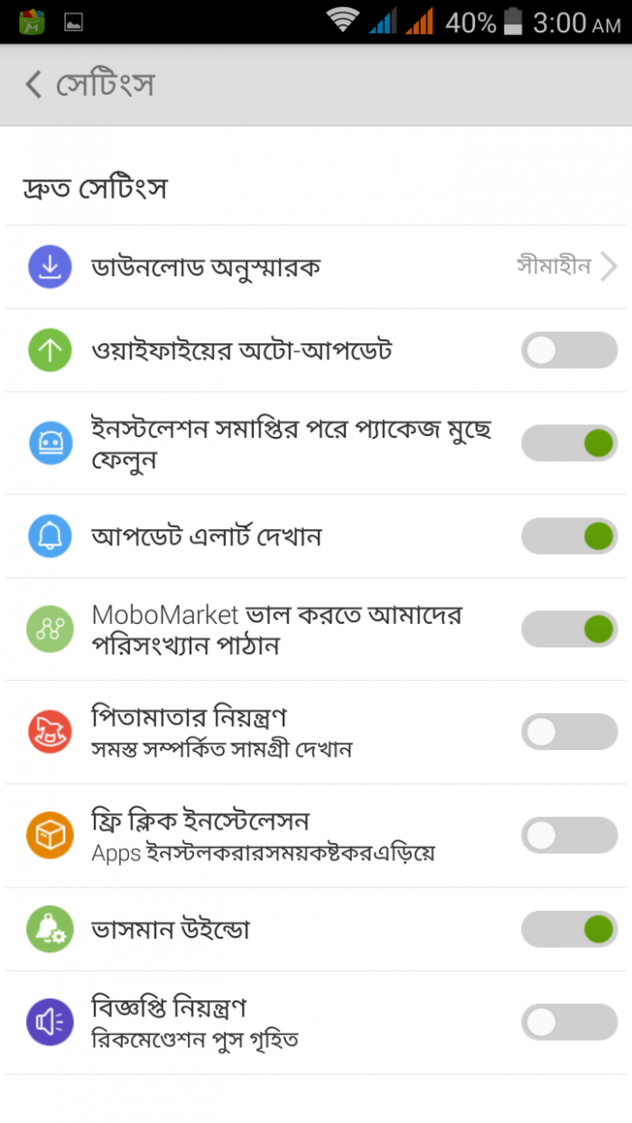 Mobo Market এর Tools>Settings রয়েছে Mobo Market অ্যাপের নানা ফিচার রিচ সেটিং।