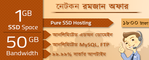 আমাদের এই অফার তে থাকছে ১ জিবি পিওর SSD ডিস্ক স্পেস / ৫০ জিবি ব্যান্ডউইথ । মাত্র ১৮০০ টাকায়।