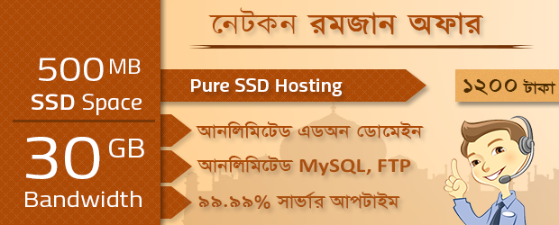 আমাদের এই অফার তে থাকছে ৫০০এমবি পিওর SSD ডিস্ক স্পেস / ৩০ জিবি ব্যান্ডউইথ । মাত্র ১২০০ টাকা।