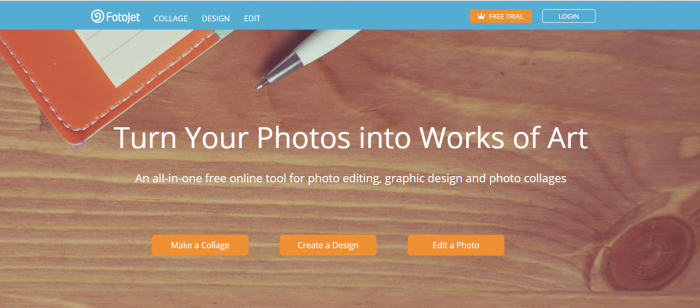 শুধু মাএ গ্রাফিক্স ইডিটিং -এই FotoJet সীমাবদ্ধ নয়। ফ্লেয়ার, ব্রুশিয়ার, টিউনার, ফটোকভার সবকিছুতেই করতে পারবেন FotoJet -এর মাধ্যমে।FotoJet আপনার যেকোনো ফটোকে রূপান্তরিত করবে একটি আর্টওয়ার্কে। FotoJet একটি অল ইন ওয়ান ফ্রি অনলাইন টুল। যার মাধ্যমে আপনি ফটো ইডিটিং, গ্রাফিক্স ডিজাইন, ফটো কলাজ তৈরি করতে পারবেন।FotoJet -এর কলাজ মেকার এর মাধ্যমে আপনি আপনার ফটোগুলো নিয়ে কলাজ তৈরি করতে পারবেন সর্ম্পূণ ইউনিক ওয়েতে।