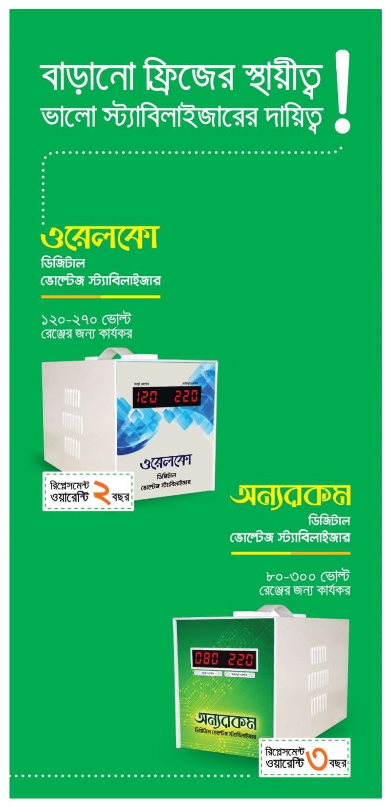 ফ্রিজের স্থায়িত্ব বাড়াতে চাই ভালো মানের ডিজিটাল স্ট্যাবিলাইজার। অন্যরকম ইলেকট্রনিক্স-এর ডিজিটাল স্ট্যাবিলাইজার যেকোন ব্র্যান্ডের ফ্রিজের জন্যে কার্যকরঃ