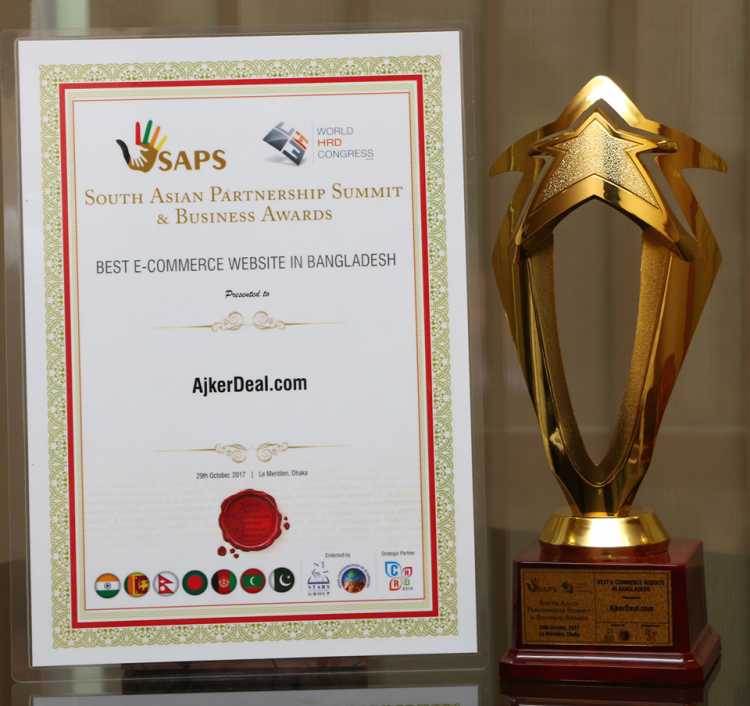 সম্প্রতি ই-কমার্স সেবা খাতে দেশের সেরা প্রতিষ্ঠানের স্বীকৃতি পেয়েছে আজকেরডিল ডটকম। (সাউথ এশিয়ান পার্টনারশিপ সামিট) এসএপিএস বাংলাদেশের বেস্ট ই-কমার্স সাইট হিসেবে আজকের ডিলের নাম ঘোষনা করে। বাংলাদেশসহ দক্ষিণ এশিয়ার বেশ কয়টি প্রতিষ্ঠান বিভিন্ন ক্যাটাগরিতে পুরস্কার অর্জন করে। এর মধ্যে ই-কমার্স ক্যাটাগরিতে ‘বেস্ট ই-কমার্স সাইট ইন বাংলাদেশ’ হিসেবে উঠে আসে আজকেরডিলের নাম।