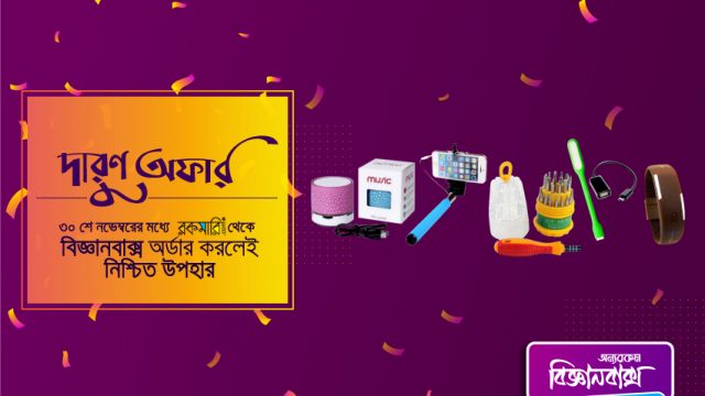 বাংলাদেশের প্রথম এবং একমাত্র সায়েন্স কিট বিজ্ঞানবাক্সের সেরা অফার চলছে এখন। মিস করা উচিত হবে না কোনোভাবেই! ৩০শে নভেম্বরের মধ্যে অনলাইনে বিজ্ঞানবাক্স অর্ডার করলে পাচ্ছেন দুর্দান্ত সব উপহার! ১টি বিজ্ঞানবাক্স নিলে এলইডি লাইট। ২টি অথবা ৩টি নিলে স্ক্রু ড্রাইভার সেট অথবা সেলফি স্টিক ৪টি নিলে এলইডি ওয়াচ এবং ৫টি নিলে ব্লু টুথ স্পিকার!