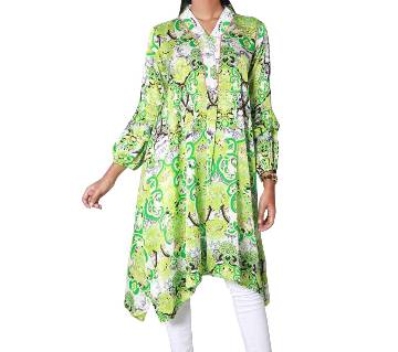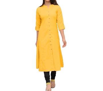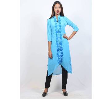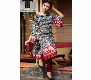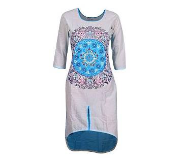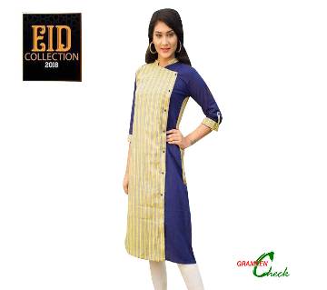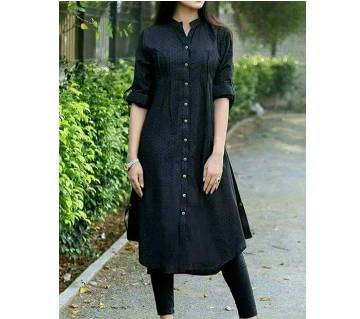 লং কামিজের মতো লম্বা আর ঢিলেঢালা কুর্তিও এখন অনেকের পছন্দ। সুতি কিংবা লিনেন কাপড়ের হওয়ায় কুর্তিগুলো পরেও আরাম। এগুলোর সামনের দিকটায় থাকে এক রঙের কোনো কাপড় আর পেছনের দিকটায় জবরজং প্রিন্টের কাপড়। হাইনেক কলার ও ফুল স্লিভ কিংবা থ্রি-কোয়ার্টার হাতার কুর্তিগুলোর জমিনজুড়ে থাকে নানা মোটিফ।