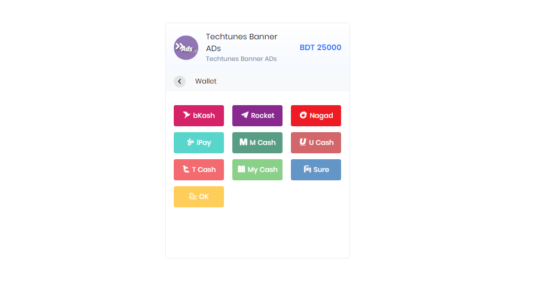 আপনি বিকাশ, রকেট, নগদ এর মাধ্যমে অথবা ব্র্যাক ব্যাংক, সিটি ব্যাংক এর মাধ্যমে BDT তে পেমেন্ট করে টেকটিউনস এর যে কোন প্রোডাক্ট কিনতে পারবেন।