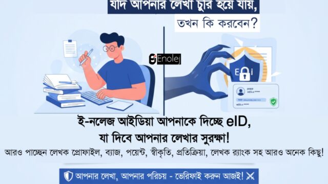 ই-নলেজ আইডিয়া—আপনার কেন্দ্রীয় লেখালেখির ঠিকানা। প্রতিটি লেখার জন্য থাকছে ভেরিফাইড টিউন আইডি (eID), আর আপনার জন্য কেন্দ্রীয় লেখক আইডি নম্বর—যেটা ব্যবহার করতে পারেন Bio, CV, কিংবা বই-র রেফারেন্সে। আর ই-আইডি(eID) জুড়ে দিবেন প্রতিটি লেখার সঙ্গে। (যেমন- টিউন eID: ১২৩ ; #eID_123 #enolej)। ফলে কপিরাইট সুরক্ষা থাকবে নিশ্চিত, আর পাঠক থাকবে মূল লেখকের সংস্পর্শে। আর ভেরিফাই হলে করতে পারবেন আপনার পেজ কিংবা ব্লগ এর ফ্রি প্রমোশন!