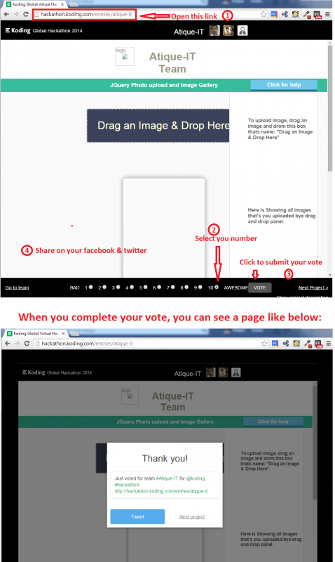 আশা করি সবাই ভালো আছেন। সকল বন্ধুদের সাহায্য চাচ্ছি, আমি ও আমার টিম (Atique IT) koding.com আয়োজিত (KODING GLOBAL HACKATHON) একটি কোডিং এর প্রতিযোগিতায় অংশ নিয়েছিলাম আর খুশির খবর হলো আমরা প্রথম ও দ্বিতীয় পর্বে টিকে গেছি। এখন সর্বশেষ পর্ব - ভোট। ভোটে যদি আমরা প্রথম হতে পারি তবে এই প্রোগ্রামিং প্রতিযোগিতাটি আমরা জিতে যাব - যা শুধু আমার নয়, পুরো বাংলাদেশের গর্ব। তাই বাঙালী হিসেবে প্রতিটি বাঙালীর কাছে আমার আকুল আবেদন, আমাদের দুটি মিনিট সময় দিন আর আপনাদের মূল্যবান ভোটটি দিন।