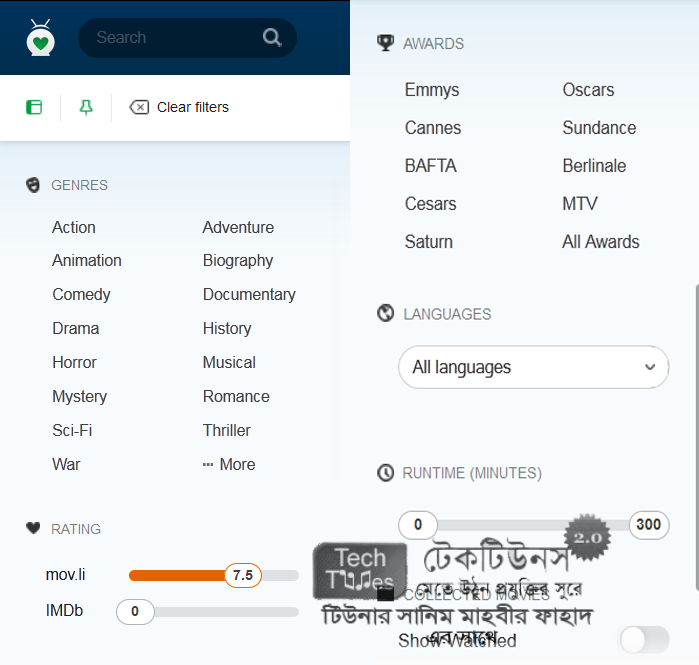 মুভির এই বিশাল সমুদ্রের মাঝে ঠিক আপনার পছন্দ মতো মুভি খুঁজে পেতেই রয়েছে আকর্ষনীয় ফিল্টারিং সুবিধা। আপনি নির্দিস্ট ভাষা, মুভির টাইপ, রেটিং, অ্যাওয়ার্ড এবং মুভি টাইমের উপর ভিত্তি করে আপনার পছন্দ মতো মুভি খুঁজে পাবেন। আমি ব্যক্তিগতভাবে কোরিয়ান রোমান্টিক মুভি এবং চাইনিজ যুদ্ধ এবং হরর মুভিগুলো পছন্দ করি। সেই অনুযায়ী মুভি খুঁজে পেতে কোন সমস্যা হয়নি।