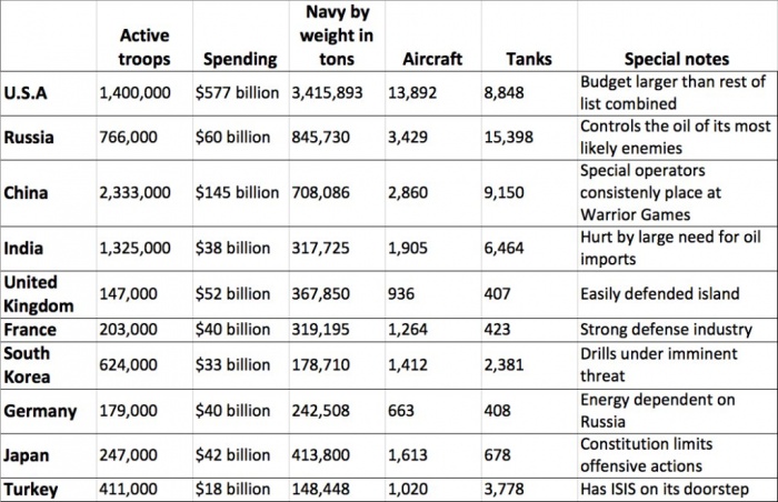 প্রথমেই দেখে নিই দেশগুলোর সামরিক খাতে বাজেট এবং কি কি আছে সেই সব দেশে। এক পলকে সব গুলো দেশের সামরিক ব্যবস্থা ক্রমানুসারে-
