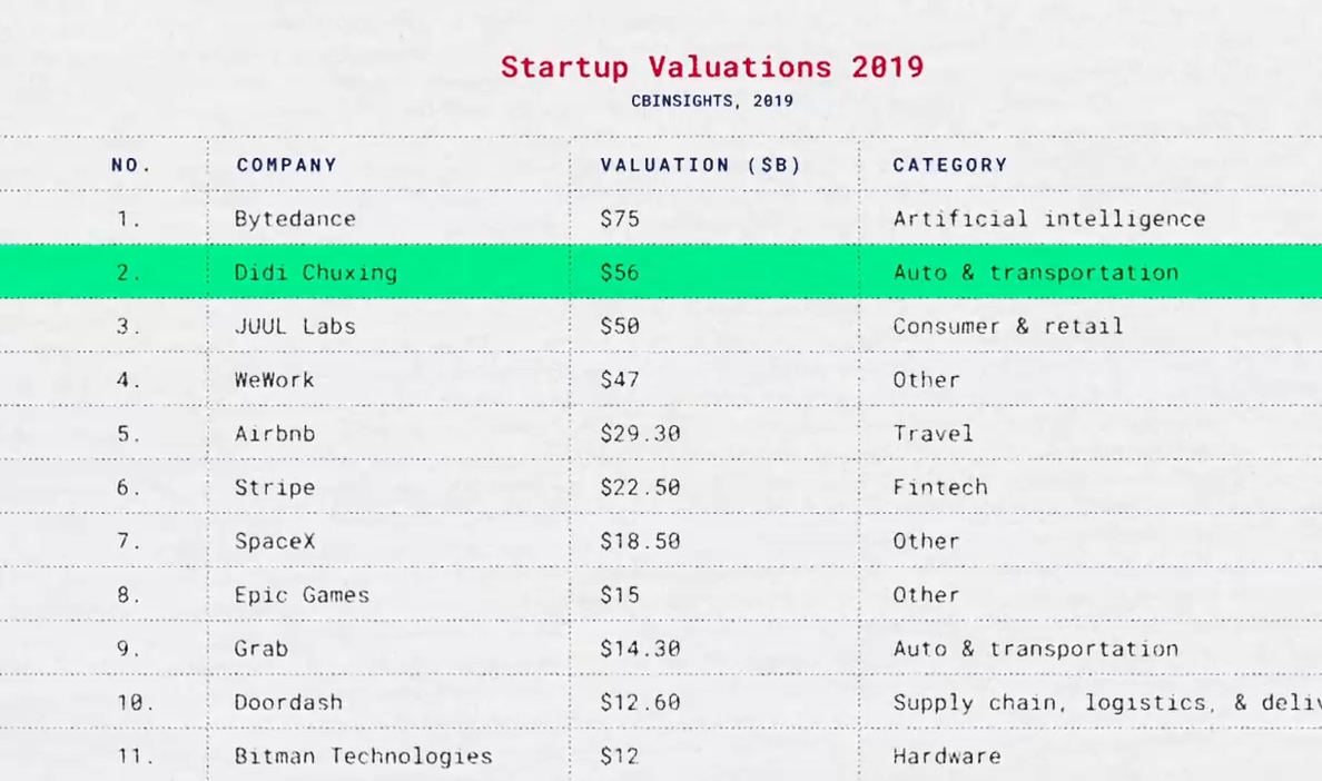 DiDi ৫৬ বিলিয়ন ডলারের বিশ্বের ২য় অন্যতম স্টার্ট আপ। তবে উবারের IPO তে বিপর্যয়ের কারণে DiDi- এর ভ্যালুয়েশন (মূল্যমান) প্রশ্নবিদ্ধ হয়। DiDi বেসরকারি ভাবে প্রায় ৬০% শেয়ারের ব্যবসায় করে। বিনিয়োগকারীরা এক সময় সন্দেহ করছিল এই রাইড শেয়ারিং কোম্পানিগুলো আসলেই লাভ করতে পারবে কিনা?