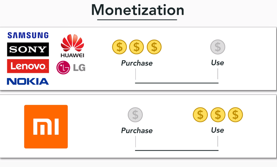 অন্যান্য গতানুগতিক ফোন কোম্পানি গুলো যা করে সেটা হচ্ছে তারা হার্ডওয়্যার বিক্রয় করে টাকা লাভ করতে চায় করে সেখানে শাউমি, প্রথমে কম মুনাফা করে ফোন বিক্রি করলেও পরবর্তীতে কাস্টমারেকে ধরে রাখতে চায় এবং তাদের সার্ভিস ব্যবহারে মাধ্যমে অধিক মুনাফা করতে চায়।