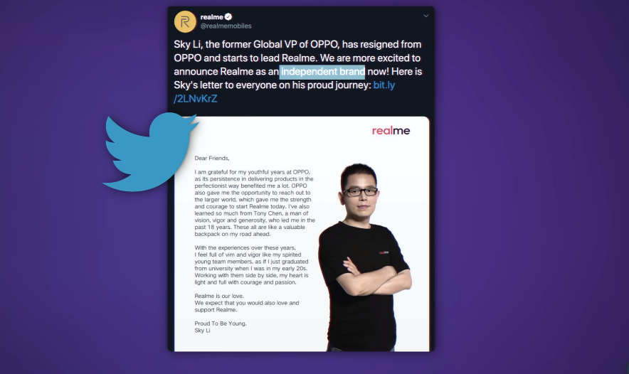 এই সময় Oppo এর গ্লোবাল ভাইস প্রেসিডেন্ট স্কাই লি, Oppo থেকে ইস্তফা নেয় এবং Realme কে আলাদা ব্র্যান্ড হিসাবে ঘোষণা দিয়ে সেখানে নেতৃত্ব করা শুরু করে। Realme একটি আলাদা স্বতন্ত্র ব্র্যান্ড হিসাবে আত্মপ্রকাশ করে এবং নিজেদের ভিন্ন লোগো ও ডিজাইনের স্মার্ট ফোন নিয়ে আসে। তারা প্রাথমিক ভাবে ১৫ টি ফোন তাদের নিজস্ব ওয়েব-স্টোর এবং ২০ মার্কেটে শক্তিশালী রিলে-ইলার দিয়ে বাজারে ছাড়ে। মাত্র ১৮ মাসের মধ্যে তারা শাউমির সকল শক্তিশালী দিক গুলো, তাদের চোখ ধাঁধানো ডিজাইন, পারফর্মেন্স দিয়ে টেক্কা দিতে থাকে।