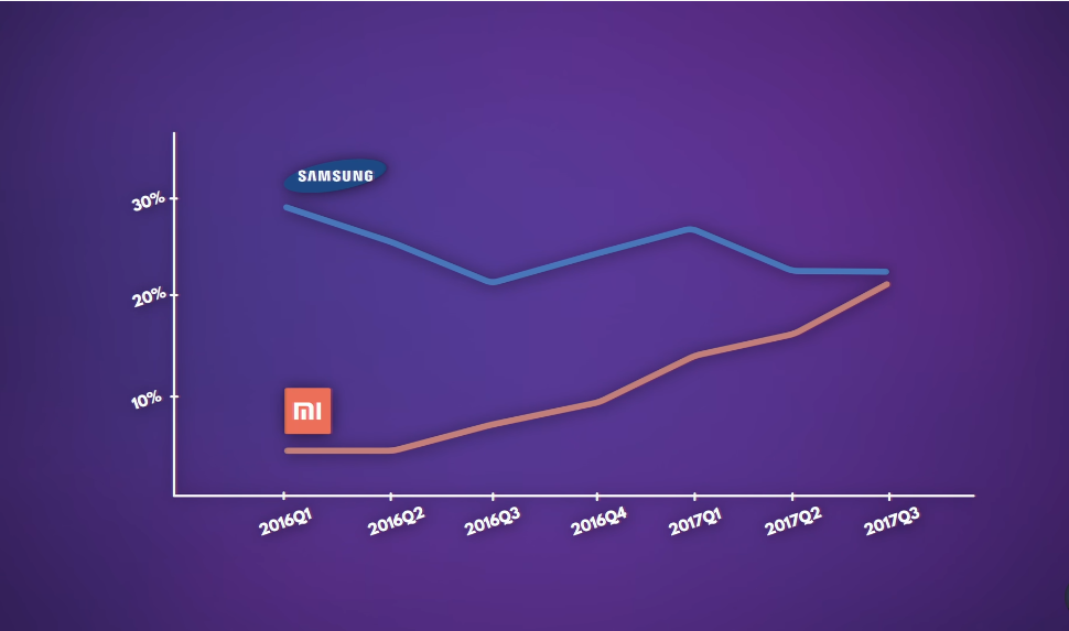 ২০১৮ সালের জানুয়ারি মাসে শাউমি, Samsung কে পেছনে ফেলে ভারতের ১ নাম্বার মোবাইল কোম্পানিতে পরিণত হয় এবং যা পরিমানের দিক থেকে বিশ্বের ২য় সর্বোচ্চ স্মার্ট ফোন ব্র্যান্ড। ২ বছর পর কোম্পানির গতি এতটায় বেড়ে যায় যে এটি দেশের প্রায় চতুর্থাংশ ফোন সাপ্লাই দেয় এবং তাদের এই উত্থানটি ছিল প্রায় অবিশ্বাস্য।
