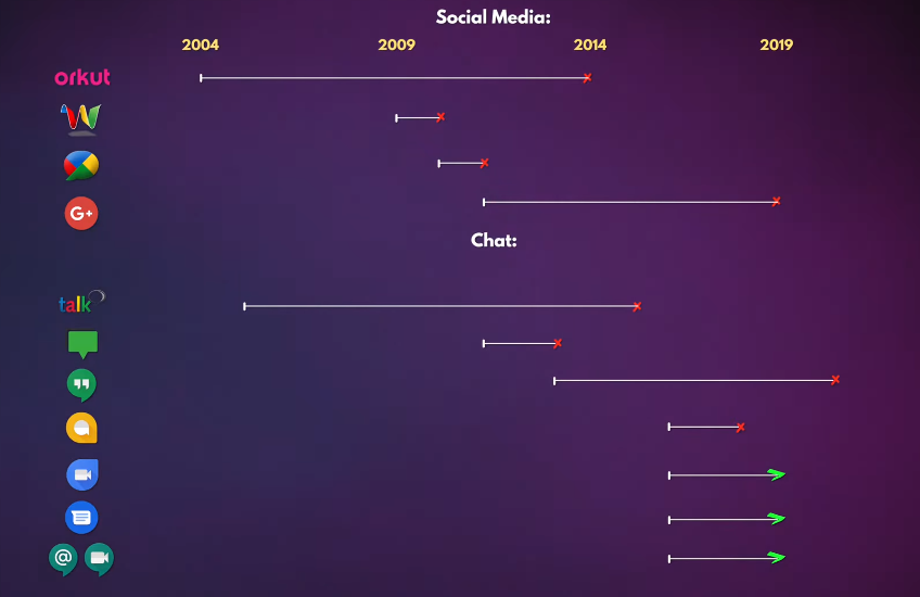 এখানে আমরা গুগলে মেসেজিং অ্যাপ প্রতিষ্ঠা করার পদক্ষেপ গুলা দেখতে পাচ্ছি এবং সাথে সোশ্যাল মিডিয়াও। আমরা এই ছবিটি থেকে দুইটি বিষয় বুঝতে পারি প্রথমত, গুগলের ব্যর্থতার কারণ এটা ছিল না যে তারা চেষ্টা করে নি, তারা বারবার চেষ্টা করে গেছে তারপরেও ব্যর্থ হয়েছে। দ্বিতীয়ত হচ্ছে এটা পরিষ্কার যে গুগল সব সময়ই সোশ্যাল ট্রেন্ড গুলো দেরিতে ফলো করেছিল।
