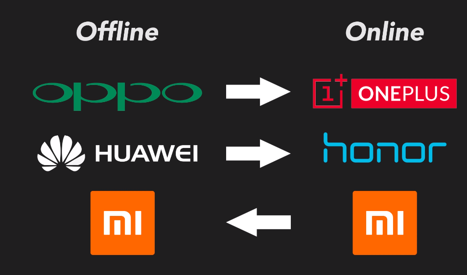 Oppo এর অনলাইন ব্রান্ড হচ্ছে OnePlus আর Huawei এর অনলাইন ব্রান্ড হল Honor। অফলাইন ব্রান্ড গুলো প্রায়ই তাদের ফোন গুলোতে প্রিমিয়াম ফিচার আগেই নিয়ে আসে যেমন Oppo তাদের ফোনের সুপার ফার্স্ট চার্জার ফিচার আনে দুই বছর আগে এবং দুই বছর পরে OnePlus এর এই ফিচার দেয়া হয় Dash Charger নামে। অন্য দিকে Huawei ফোনের Duo Camera ফিচারটিও Honor এ পরে আসে। অফলাইন ফোন গুলো তাদের ক্রেতাদের আকৃষ্ট করতে প্রিমিয়াম মার্কেটিং করে থাকে এজন্য তাদের ফোনের দাম স্বাভাবিক ভাবেই বেশি থাকে। অন্যদিকে অনলাইন ব্র্যান্ডের এমনটি করা লাগে না। এর জন্য দামও থাকে সাধ্যের মধ্যে।