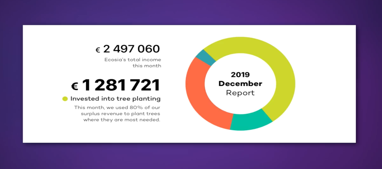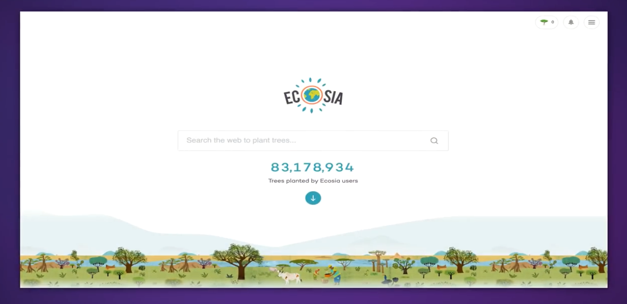 Ecosia জনপ্রিয় কারণ একটি অমুনাফাভোগী প্রতিষ্ঠান তারা তাদের আয়ের একটি অংশ পরিবেশ রক্ষার কাজে ব্যবহার করে। তাদের প্রধান উদ্দেশ্য হচ্ছে বৃক্ষ রোপণ।