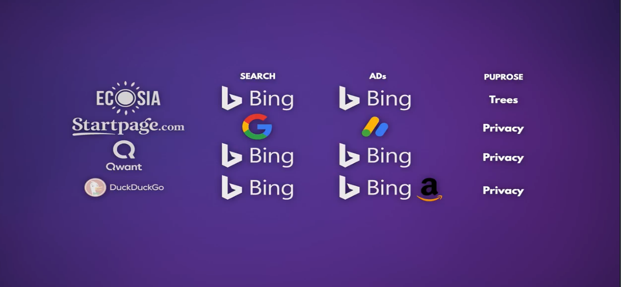 Startpage এর মত আরও দুইটি সার্চ ইঞ্জিন যেমন, DuckDuckGo এবং Qwant। তারাও একই ভাবে Google এবং Bing এর উপর নির্ভরশীল। এই সার্চ ইঞ্জিন গুলোর মধ্যে আরেকটি সার্চ ইঞ্জিন আছে যার না Ecosia। Ecosia হচ্ছে এখানে সবচেয়ে জনপ্রিয়। Ecosia ও একই ভাবে তাদের সার্চ রেজাল্ট তাদের ইউজারের প্রাইভেসি গোপন রেখে বিভিন্ন আফ্যলিয়েট লিংক যেমন Amazon, eBay এড দেখিয়ে আয় করে থাকে।