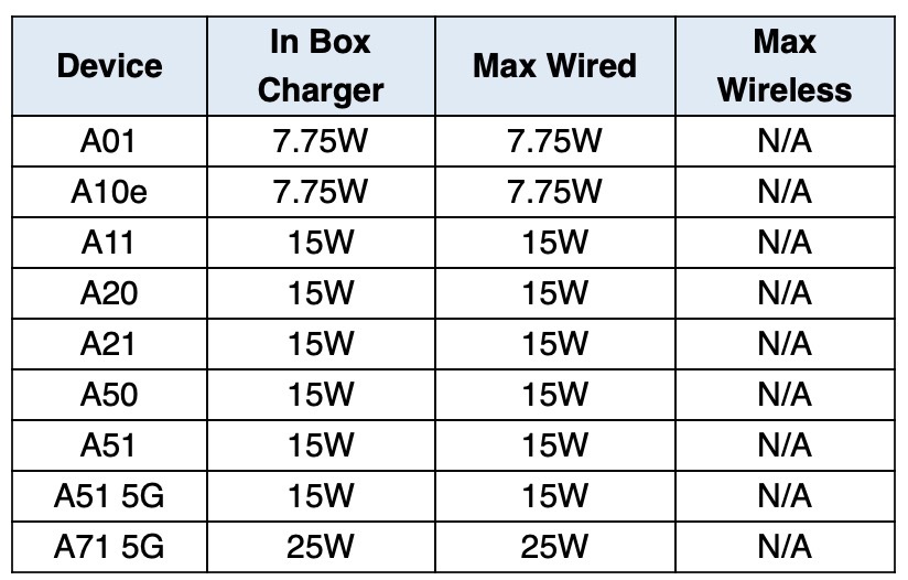 Samsung এর Adaptive Fast Charging ঠিক Qualcomm এর Quick Charge এর মতই voltage বা amperage বাম্প করে ফাস্ট চার্জ করে থাকে। তবে Samsung তাদের Adaptive Fast Charging এর প্রোটোকল স্পেসিফিকেশন গোপন রাখে বা তারা ফুল চার্জ করতে কত সময় লাগবে সে সম্পর্কেও কোন তথ্য প্রদান করে না, তবে নিচে ফাস্ট চার্জিংয়ের স্পীড এবং সাপোর্টেড ডিভাইসের তালিকা দেওয়া হল।
