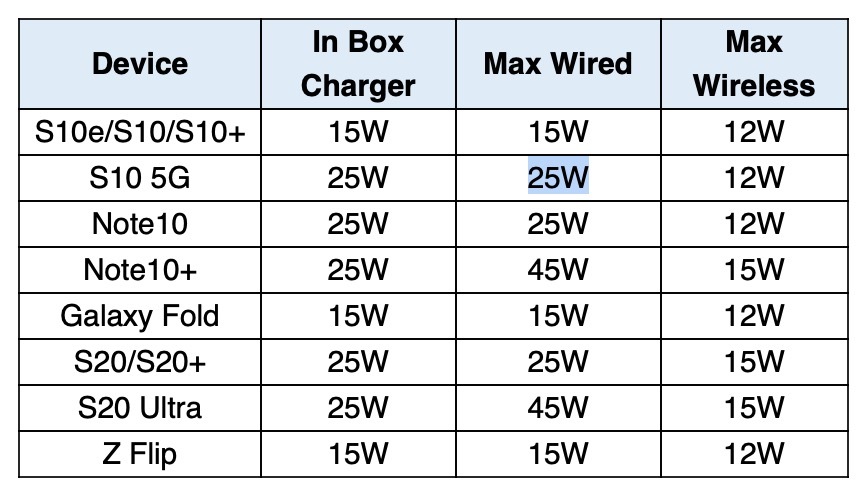 Samsung এর সাধারণ 10V/4.5W অ্যাডাপ্টার দিয়ে গ্যালাক্সি এস 20 আল্ট্রা এবং নোট 10+ তাত্ত্বিকভাবে 45W পাওয়ারে চার্জ করতে পারে। আর Samsung বর্তমান প্রজন্মের বেশিরভাগ ফ্ল্যাগশিপ ফোনগুলোর বক্সের সাথে দেওয়া অ্যাডাপ্টারের সাহায্যে সর্বোচ্চ 25W পর্যন্ত Adaptive Fast Charging সাপোর্ট করে। তবে এটি লক্ষণীয় যে, Samsung এর কিছু ফোন Qualcomm এর Quick Charge এর পুরাতন ভার্সন সাপোর্ট করে এমন ফোনগুলোতে Samsung অ্যাডাপ্টার ব্যবহার করে তুলনামূলক ভাবে বেশি স্পীডে ফোন চার্জ করতে পারবেন।