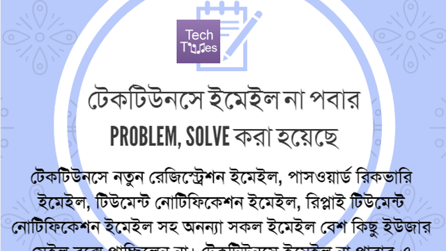 টেকটিউনসে নতুন রেজিস্ট্রেশন ইমেইল, পাসওয়ার্ড রিকভারি ইমেইল, টিউমেন্ট নোটিফিকেশন ইমেইল, রিপ্লাই টিউমেন্ট নোটিফিকেশন ইমেইল সহ অনন্যা সকল ইমেইল বেশ কিছু ইউজার মেইল বক্সে পাচ্ছিলেন না। টেকটিউনসে ইমেইল না পবার এ PROBLEM টি, Solve করা হয়েছে।
