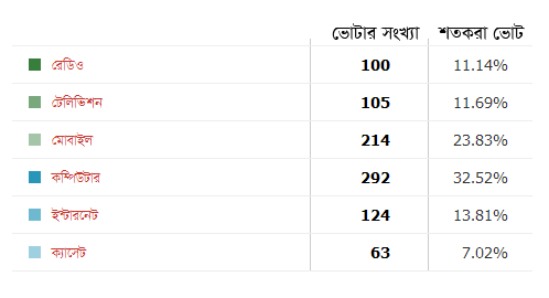 জরিপের ফলাফল থেকে বোঝা যাচ্ছে "কম্পিউটার" সর্বমোট ২৯২টি ভোট পেয়ে জয়ী হয়েছে। ২১৪টি ভোট পেয়ে মোবাইল দ্বিতীয় অবস্থানে, এর পরেই আছে ইন্টারনেট, এরপর টেলিভিশন, তারপর রেডিও এবং সবচেয়ে কম ভোট পেয়েছে ক্যাসেট। ক্যাসেটের ভাগে আরও একটু ভোট জুটত কারণ আমি প্রায় সাতদিন পরে পোলে "ক্যাসেট" যুক্ত করেছি।