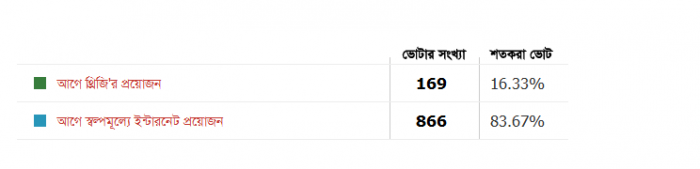 আগে স্বল্পমূল্যে ইন্টারনেট প্রয়োজনউপরের ফলাফল অনুযায়ী "আগে থ্রিজি'র প্রয়োজন" পেয়েছে সর্বমোট ১৬৯টি ভোট। এবং সর্বাধিক ভোটে অর্থাৎ ৮৬৬ জনের বিপুল পরিমান ভোটে জয়ী হয়েছে "আগে স্বল্পমূল্যে ইন্টারনেট প্রয়োজন"