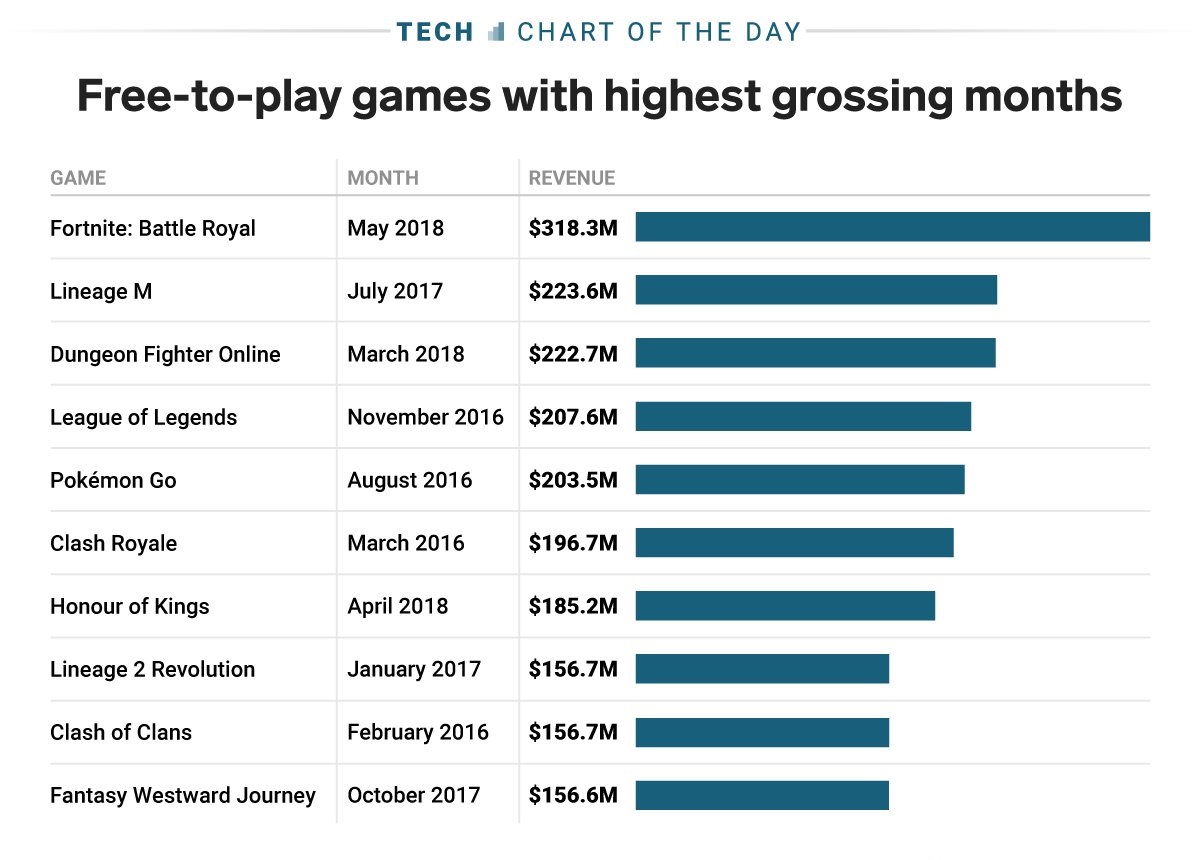২০১৭ সালে লঞ্চ হওয়া জনপ্রিয় Free-to-play ভিডিও Fortnite গত মে মাসে প্রায় ৩১৮ মিলিয়ন মার্কিন ডলার আয় করেছে বলে নিশ্চিত হওয়া গিয়েছে। যা একটি বিরল রেকর্ড হিসেবে গড়ে উঠেছে। গেমিং ইতিহাসে কোনো প্লাটফর্মের কোনো গেম এক মাসে এই পরিমাণ অর্থ আয় করতে পারেনি। তবে একটি ফ্রি গেম হিসেবেও কিভাবে Fortnite এই রেকর্ড করলো? ফ্রি গেম হলেও Fortnite গেমটির বিভিন্ন উপদান যেমন প্লেয়ার আউটফিট, ক্যারেক্টার, টুলস ইত্যাদি থেকে কোম্পানিটি ব্যবহারকারীদের কাছ থেকে অর্থ আয় করে থাকে। ২০১৭ সালের জুলাই মাসে লঞ্চ হওয়া পর এ পর্যন্ত গেমটি প্রায় ১.২ (এক দশমিক দুই) বিলিয়ন মার্কিন ডলার লাভ আয় করতে সক্ষম হয়েছে।