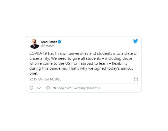 Microsoft এর প্রেসিডেন্ট Brad Smith ব্রিফে সাইন করার সম্পর্কে একটি টুইট করেন এবং জানান এই মহামারীতে আন্তর্জাতিক শিক্ষার্থীদের ব্যাপারে অবশ্যই নমনীয়তা দেখাতে হবে। জানা যায় মাইক্রোসফট এর মালিকানাধীন LinkedIn ও GitHub একই সাথে এই সংক্ষেপে স্বাক্ষর করেছ।