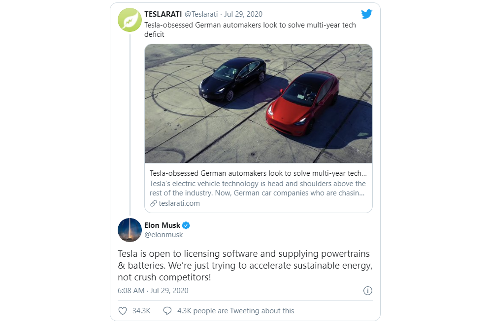 Tesla এর CEO, Elon Musk তার একটি টুইটের মাধ্যমে বলেন, "টেসলা লাইসেন্সিং, সফটওয়্যার, Powertrain এবং Battery সরবরাহের জন্য উন্মুক্ত। আমরা কেবল টেকসই শক্তিকে ত্বরান্বিত করার চেষ্টা করছি, প্রতিযোগীদের সাথে সংঘর্ষে যেতে চাচ্ছি না"।