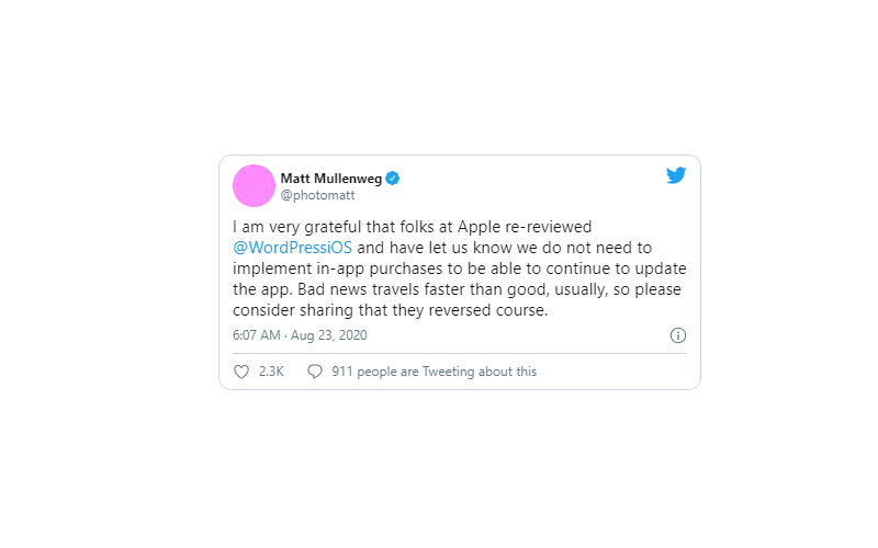 ওয়ার্ড-প্রেস এর প্রতিষ্ঠাকালীন ডেভেলপার, Matt Mullenweg কিছু দিন আগে একটি টুইটে জানান, "Apple তাদের WordPress অ্যাপ এর আপডেট ব্লক করে রেখেছে, এবং ডেভেলপারদের চাপ দিচ্ছে যেন তারা আপডেট চালু হবার জন্য পেমেন্ট মেথড যোগ করে"। তিনি আরও জানান Apple এর পরিকল্পনা ছিল পেমেন্ট অপশন চালু করে ইউজারের কাছ থেকে অর্থ সংগ্রহ করা।