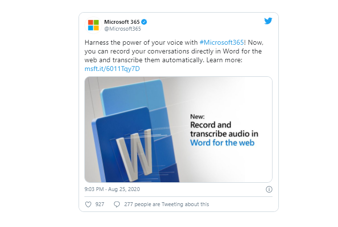 Google Docs এর প্রতিদ্বন্দ্বী Word for the Web এ ফিচারটি ব্যবহার করা যাবে। যদিও Word for the Web ফ্রিতে ব্যবহার করা যায় তবে এর Transcribe ফিচারটি ব্যবহার করতে হলে ইউজারকে প্রিমিয়াম সাবস্ক্রাইবার হতে হবে।