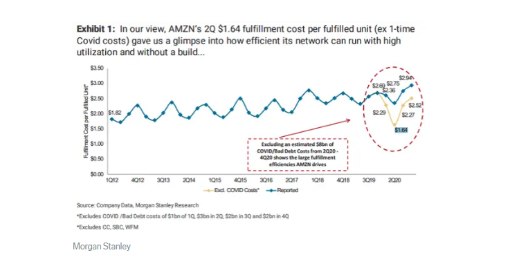 সোমবার প্রকাশিত Morgan Stanley এর এক প্রতিবেদনে বলা হয়েছে, দ্বিতীয় ত্রৈমাসিকে Amazon প্রতিটি পণ্যের প্যাকিং এবং শিপিংয়ে ১.৬৫ ডলার ব্যয় করছে। তবে এটা কোম্পানির COVID-19 এবং বিভিন্ন উদ্যোগের খরচ বাদে, সব খরচ এক সাথে হলে এতে ব্যয় হবে ২.৩ ডলার।