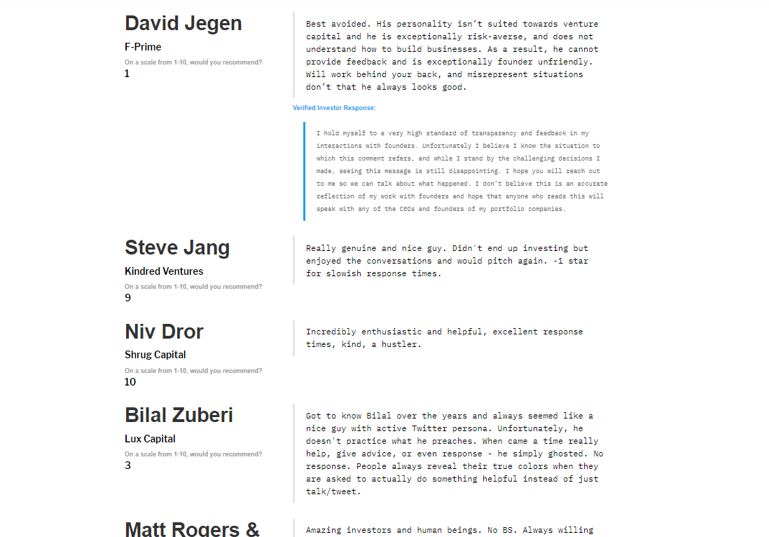 রিভিউ গুলোতে দেখা যায় কিছু কিছু ভেঞ্চার ক্যাপিটাল ফার্ম অমানবিক রুল দিয়ে রেখেছে যা সংস্থাগুলির ক্ষতি করে, " কোনটিকে আবার বলা হচ্ছে "কিংবদন্তি" এবং কেউ কেউ কোন ভেঞ্চার ক্যাপিটাল ফার্মকে বলছে, "বিনিয়োগ সম্প্রদায়ের সত্যই একটি লুকানো রত্ন"।