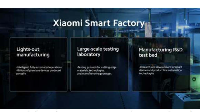 এক মিলিয়ন ইউনিটের বার্ষিক উৎপাদন ক্ষমতা সহ, কারখানাটি নতুন প্রযুক্তি বিকাশ, প্রাক-গবেষণা প্রকল্পসমূহ, বেঞ্চমার্ক প্রযুক্তি উন্নয়ন এবং অটোমেশনের উপর আলোকপাত করে Xiaomi এর ফ্ল্যাগ-শিপ স্মার্ট-ফোনের জন্য তৈরি করা হয়েছে এটি।