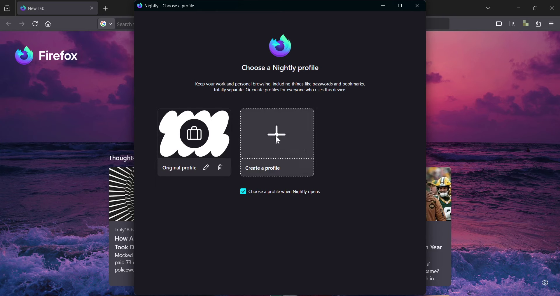 “Choose A Profile When Nightly Opens” Option টি Enable করে রাখলে, Browser Open করার সময় আপনাকে Profile Select করার জন্য Prompt করা হবে। এর মাধ্যমে আপনি খুব সহজেই আপনার পছন্দের Profile দিয়ে Browsing শুরু করতে পারবেন এবং আপনার সময় বাঁচাতে পারবেন।
