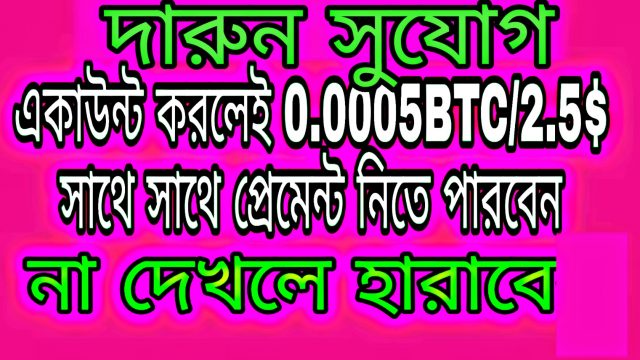 প্রিয় বন্ধুরা অাজকে অাপনাদের জন্য নিয়ে অাসলাম দারুন একটি সুযোগ। অাপনি শুধু মাত্র একাউন্ট করার সাথে সাথে 0.0005BTC মানে ২.৫$ বাংলাদেশের প্রায় ৩০০ টাকা পাবেন এবং সরাসরি সেই টাকা অাপনার বিটকয়েনে নিতে পারবেন।