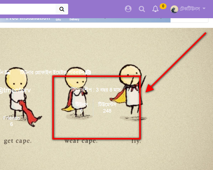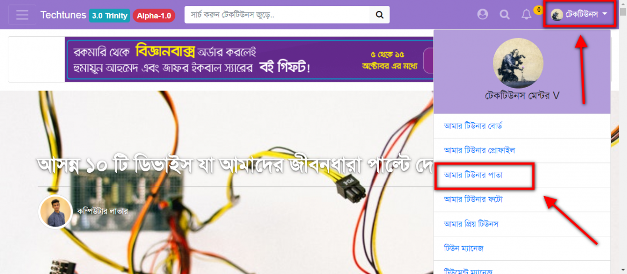 লগইন করার পর আমি টেকটিউনারের জায়গায় আপনার নাম চলে আসবে। আপনার নামের উপর ক্লিক করলে একটি ড্রপ ডাউন মেনু আসবে, সেখান থেকে আমার টিউনার পাতা অপশনটি সিলেক্ট করুন চলে আসবে টিউনার হাব।