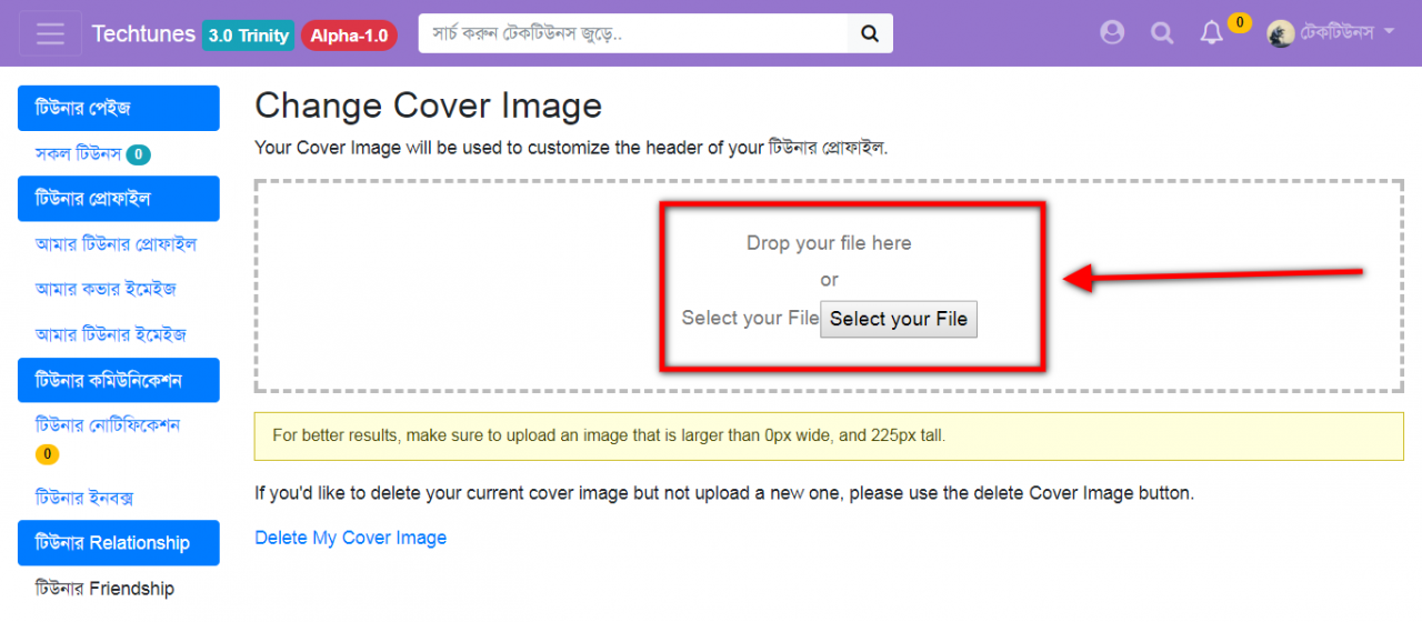 অপশনটিতে ক্লিক করার পর একটি বক্স আসবে যেখেনা আপনি কাঙ্খিত ইমেইজটি ড্রাগ করে এনে ড্রপ করতে পারবেন অথবা আপনার স্টোরেজ থেকে ইমেইজ আপলোড করার জন্য Select Your File অপশনটি ক্লিক করে ইমেইজটি আপলোড করতে পারবেন।