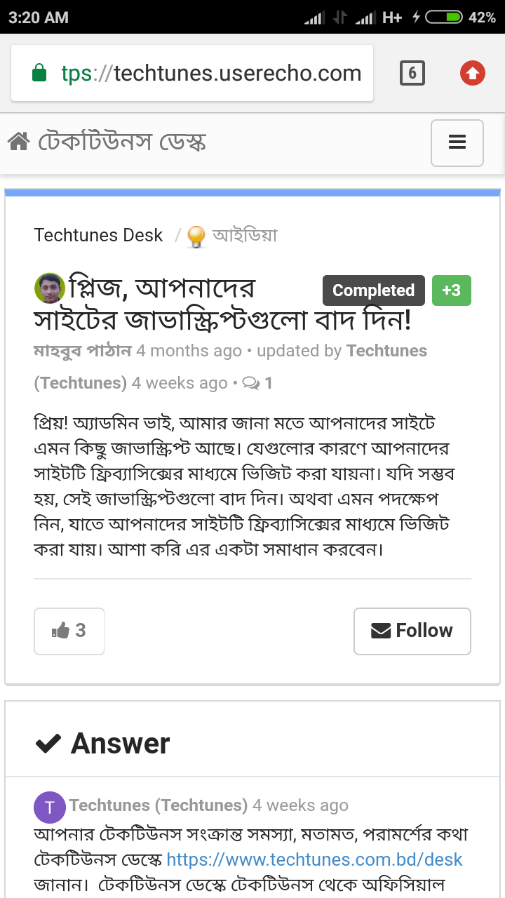 তাই আমি "টেকটিউনস" সাইটের কর্তৃপক্ষের সাথে এই নিয়ে আলোচনা করেছিলাম। অর্থাৎ এই সাইটের হেল্প ডেস্কের সাহায্যে তাদের কাছে জানিয়ে ছিলাম যে, এই সাইটে তারা যে জাভাস্ক্রিপ্ট ব্যবহার করেছেন, তা রিমোভ (বাতিল) করার জন্য। যার প্রমাণ দেখতে নিচের স্ক্রিনশটটি ফলো করুন।