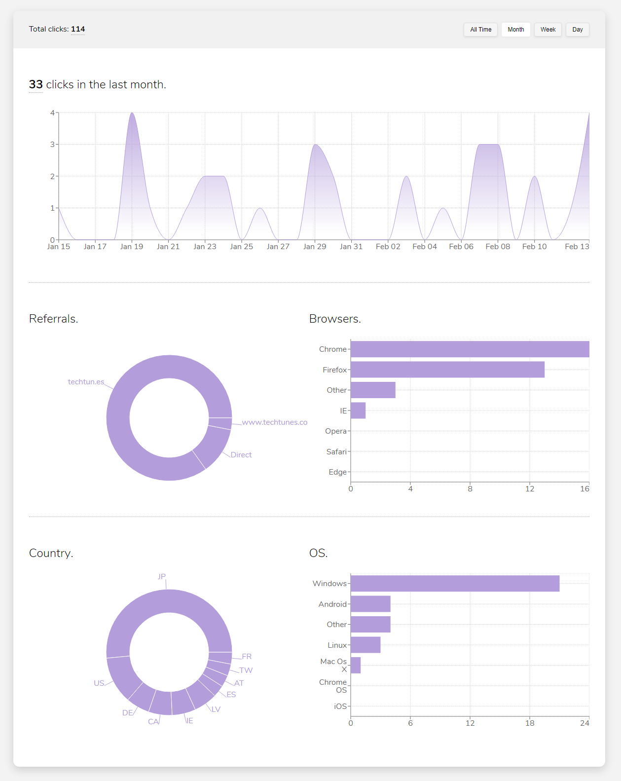 Techtunes Slash এর মাধ্যমে আপনি আপনার Short URL এ কত ক্লিক হয়েছে তা দিন, মাস, সপ্তাহ, বছর অনুযায়ী দেখতে পাবেন। তা ছাড়া সোর্স ভিত্তিক (Referrals) কোন কোন সোর্স থেকে ক্লিক হয়েছে, ব্রাউজার ভিত্তিক (Browsers), দেশ ভিত্তিক (Country) এবং অপারেটিং সিস্টেম (OS) ভিত্তিক গ্রাফ ও চার্ট দেখতে পারবেন।