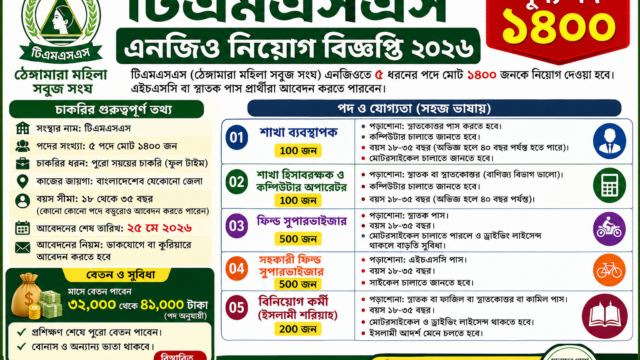 টিএমএসএস (ঠেঙ্গামারা মহিলা সবুজ সংঘ) নামের একটা এনজিওতে অনেক লোক নিয়োগ দিচ্ছে। মোট ৫ ধরনের পদে ১৪০০ জনকে চাকরি দেওয়া হবে।