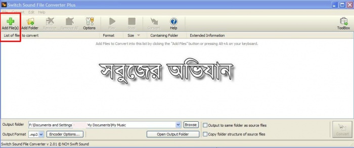 এরপর একে চালু করলে এরকম দেখাবে । এর Add Files এ ক্লিক কর।এখানে লাল বক্সের মধ্যে দেখ।