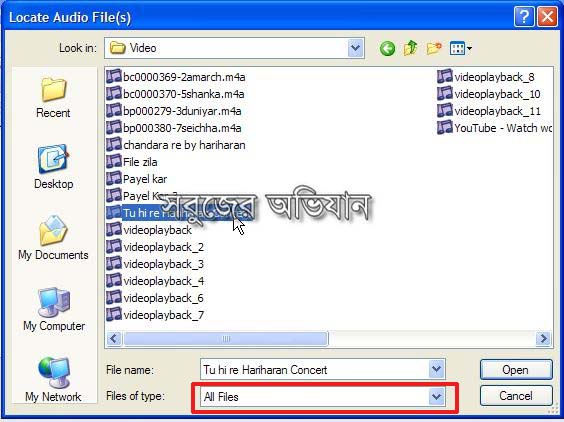 যদি তুমি Yoytube video বা যে কোনো Video file কে Mp3 বা অন্য কোনো Audio File এ কনভার্ট করতে চাও তবে যেখানে ঐ ফাইলটি আছে সেই লোকেশনে যাও Add File অপসন থেকে আগের মতোই যেখানে ঐ ভিডিও ফাইল আছে সেখানটা দেখিয়ে দাও। সেখানে প্রথমে কিন্তু তুমি কোনো ফাইলই দেখতে পাবে না।কারণ ওখানে Audio file সিলেক্ট করা আছে। এখান থেকে তোমাকে নিচের মতো করে all files সিলেক্ট করে নিতে হবে।করে নিলে তবেই তোমার Yoytube video বা ভিডিও ফাইল দেখা যাবে।