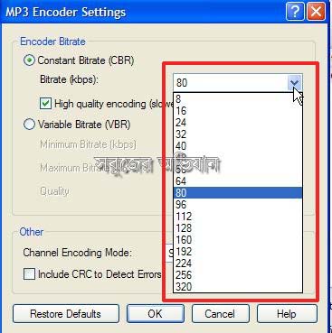 এখান থেকে Bitrate option এ যাও। ও নিজের চাহিদা অনুযায়ী সিলেক্ট কর। যদি গানের সাইজ ছোটো করতে হয় তবে bitrate কমাতে হবে।