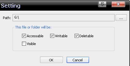 এখন Setting ডায়ালগ বক্স থেকে ব্রাউজ বাটনে ক্লিক করে যে ফোল্ডারটি লক করতে চান সেটি নির্বাচন করুন। এবার Accessable, Writeable, Deleteable, Visible থেকে দরকারী অপশনগুলো নির্বাচন করে Ok করুন।