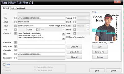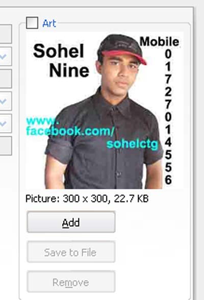দেখবেন ট্যাগ এডিটর আসবে ( উপরের মত ) Artist এ শিল্পীর নাম Album এ সিডির নাম (পাশাপাশি আপনার নাম ও মোবাইল নাম্বার ও দিতে পারেন, এভাবে অন্যান্য ঘরগুলো যেমন Comment, Url ইত্যাদি পূরন করতে পারেন, সবার ডানপাশে Art এর নিচে Add এ ক্লিক করে আপনার ছবিটি দেখিয়ে দিন (ছবি ৩০০x৩০০ হলে ভাল হয়,পারলে আগে থেকে এডিট করে নিন)